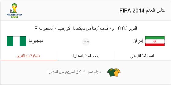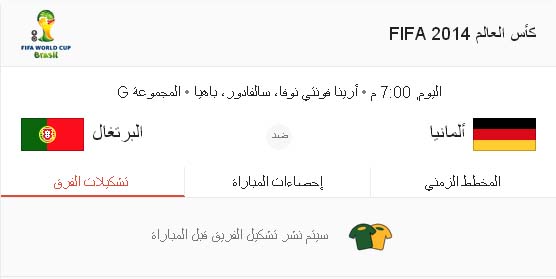 مونديال البرازيل ... مباريات اليوم 16/6/2014مونديال البرازيل ... مباريات اليوم 16/6/2014المباراة الاولىالمانيا - البرتغاللقاءات سابقة بين المنتخب الالماني ومنتخب البرتغال المباراة الثانيةايران - نيجيريا لقاءات سابقة بين منتخب ايران ومنتخب نيجيريالقاءات سابقة بين المنتخبين 16/06/2014 11:00