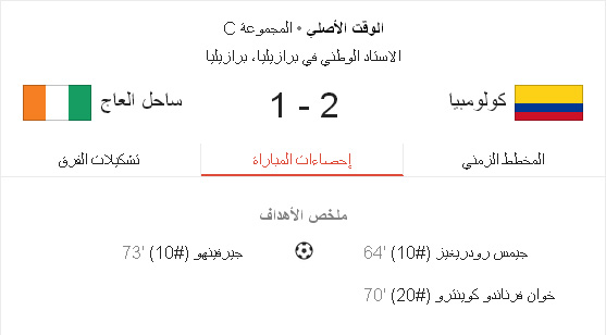 ابتعد منتخب كولومبيا في صدارة المجموعة الثالثة من نهائيات كأس العالم 2014 بعد فوزه الصعب على غريمه الإيفواري بهدفين لهدف في المباراة المثيرة التي جمعت بينهما على ملعب ماني غارينشا.وقدم الطرفان شوطاً ثانياً مثيراً شهد جميع الأهداف وتناوبا خلاله في السيطرة على المواجهة.وحملت هدفا الفائز توقيعي كلٍ من جيمس رودريغيز برأسية جميلة (70)، وكارلوس كينتيرو بحرفنة إثر انفراده بالحارس بوبكار باري (70)، فيما سجل جيرفينيو هدف الخاسر الوحيد في الدقيقة 73 بعد مجهود فني رائع.ورفع منتخب كولومبيا رصيده بهذا الفوز إلى 6 نقاطٍ في صدارة المجموعة، فيما تجمد رصيد ساحل العاج عند 3 نقاط في المركز الثاني.