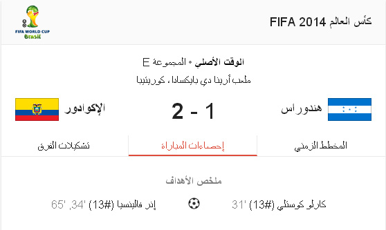 تمكن المنتخب الاكوادوري من انعاش آماله في البقاء في مونديال البرازيل، بعد تحقيقه لفوز صعب على حساب منتخب هندوراس بنتيجة 2-1، في المباراة التي اقيمت بين الفريقين لحساب الجولة الثانية من المجموعة الخامسة من مونديال البرازيل . وكان التعادل الإيجابي بهدف لمثله سيد الشوط الأول بين المنتخبين ، وكان المنتخب الهندوراسي السباق بالتهديف عبر نجمه كوستيلي في الدقيقة 31 ، قبل أن يعود الشاب اينرفالنسيا في نتيجة المباراة بشكل سريع للاكوادوريين في الدقيقة 34 .وفي الشوط الثاني ، تواصل الضغط الكبير من جانب لاعبي الإكوادور على مرمى هندوراس ، وتمكنت من تسجيل هدف الفوز على هندوراس في الدقيقة 65 عبر نفس اللاعب اينر فالنسيا بعد تمهيد متقن من ركلة حرة غير مباشرة من أيوفي تابعها فالنسيا برأسية ولا أروع من داخل منطقة الجزاء بالشباك الهندوراسية ، لينتهي اللقاء بتفوق إكوادوري بهدفين مقابل هدف .وحققت الإكوادور فوزها الأول بالبطولة بعد خسارتها الأول على يد سويسرا بهدفين مقابل هدف ، فيما تكبدت هندوراس الخسارة الثانية، ولكنها ستخوض المباراة الثالثة ضد سويسرا