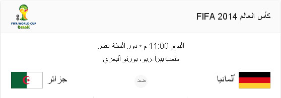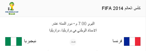 مونديال البرازيل .... مباريات اليوم 30/6/2014المباراة الاولى : فرنسا ضد نيجيريا المباراة الثانية : الجزائر ضد المانيا 30/06/2014 10:37