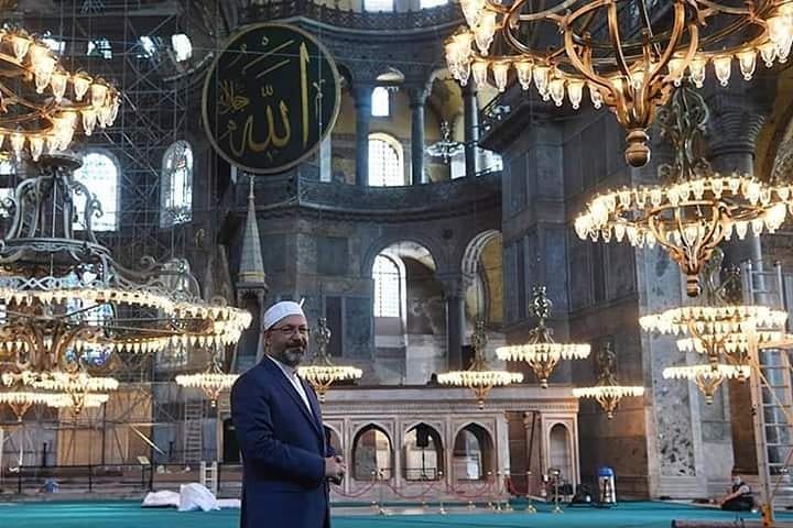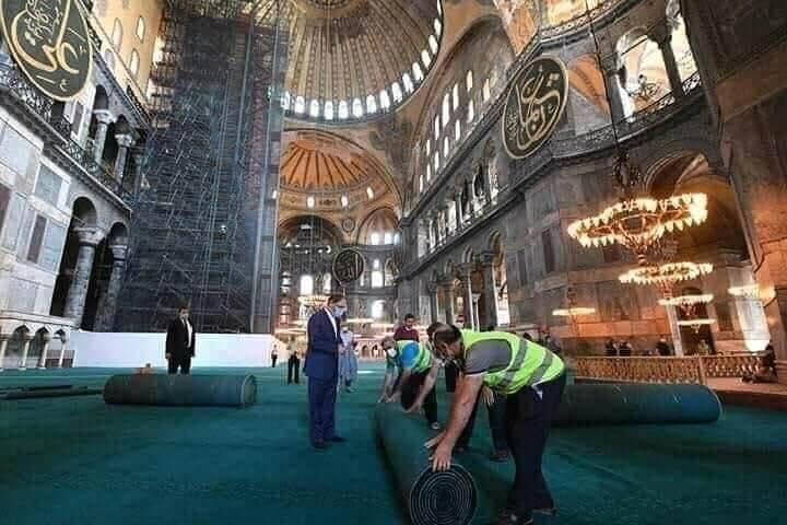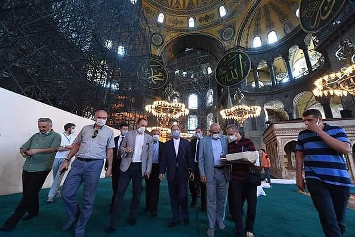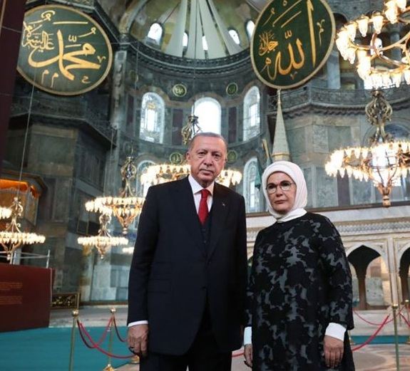 شهد الرئيس التركي رجب طيب اردوغان،برفقة عقيلته امينة اردوغان لحظة تعليق لوحة كتبت بـ 4 لغات على جدار مسجد آيا صوفيا استعداداً لاقامة اول صلاة جمعة فيه منذ 80 عاماً.