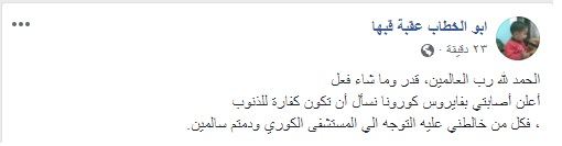 كما طالب من على صفتحه على موقع التواصل الاجتماعي،فيسبوك،المخالطين له للتجه الى المركز الكوري في جنين من أجل اجراء فحص كورونا.