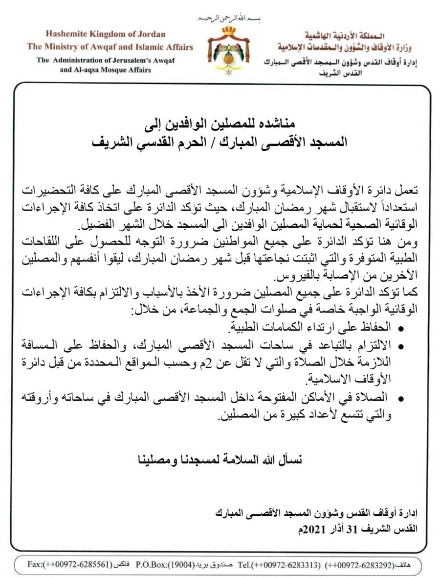 تعمل دائرة الأوقاف الإسلامية وشؤون المسجد الأقصى المبارك على كافة التحضيرات استعداداً لاستقبال شهر رمضان المبارك، حيث تؤكد الدائرة على اتخاذ كافة الإجراءات الوقائية الصحية لحماية المصلين الوافدين الى المسجد خلال الشهر الفضيل.
