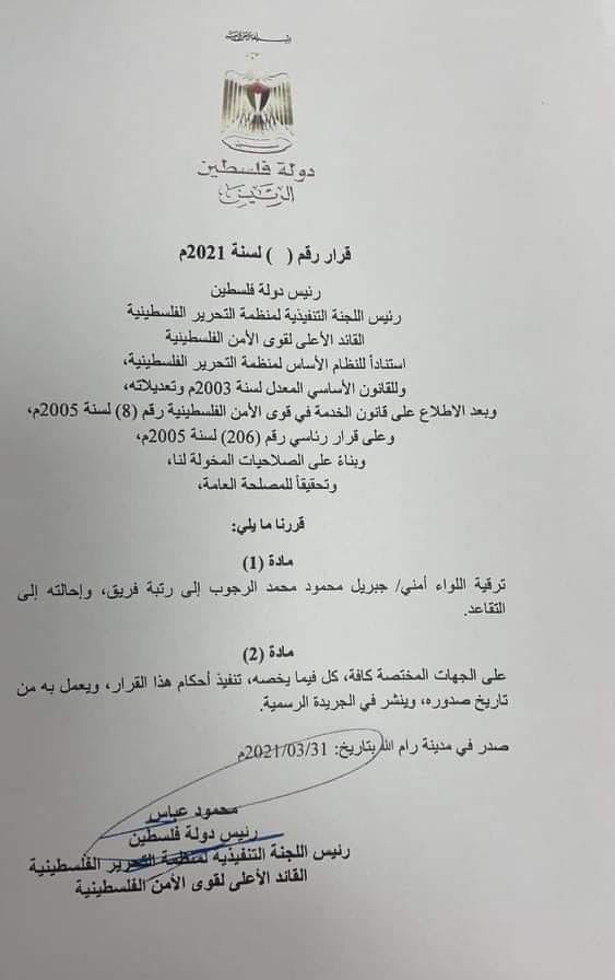 وقد تم ترقية الرجوب الى رتبة فريق وتمت احالته الى التقاعد بحس المرسوم.