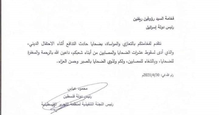 قدم الرئيس الفلسطيني محمود عباس،تعازيه الى الرئيس " الاسرائيلي " رؤوفين ريفلين في قتلى حادثة جبل الجرمق بالقرب من مدينة صفد.