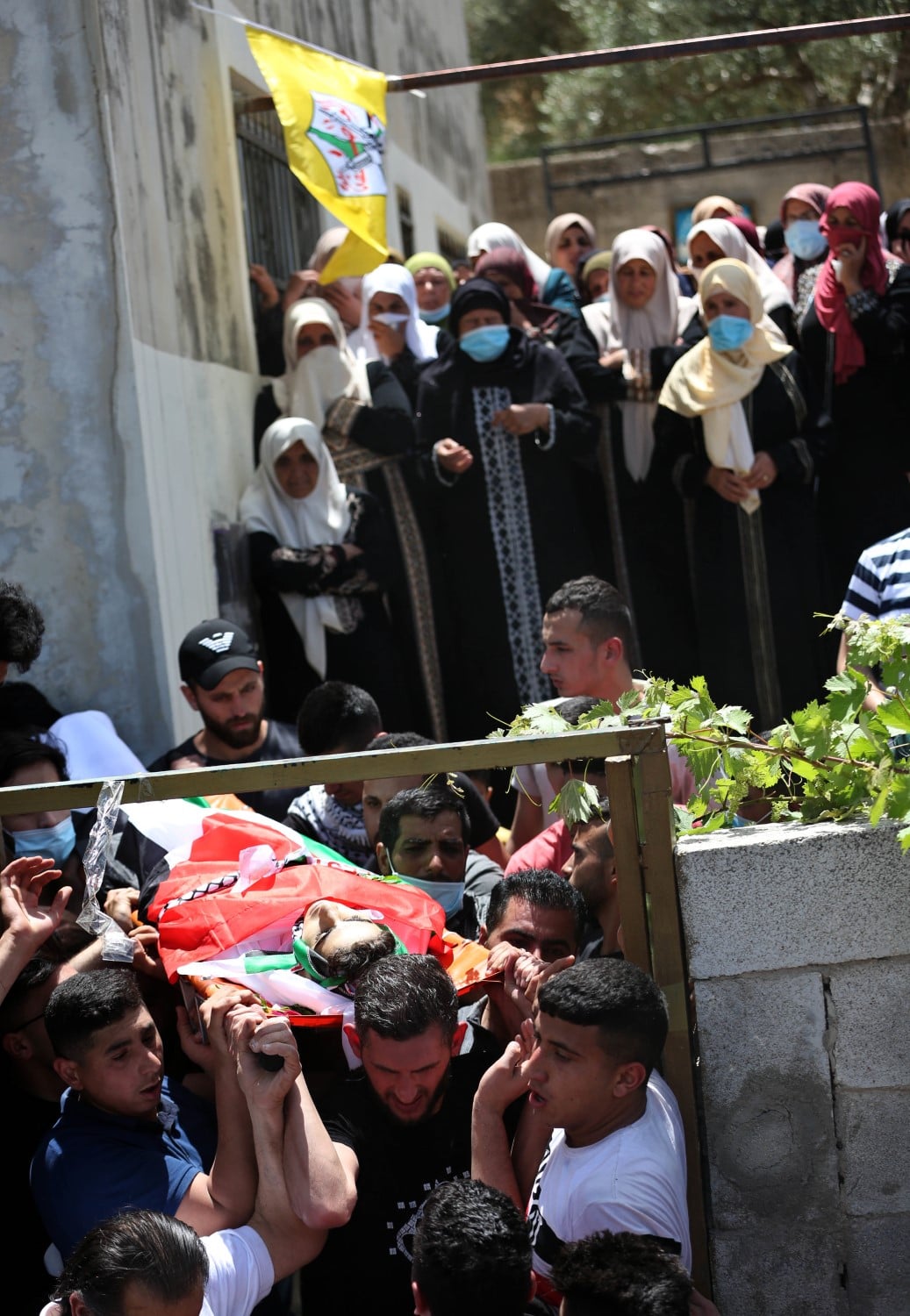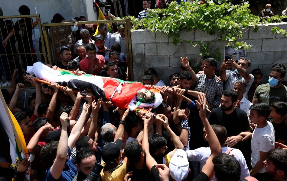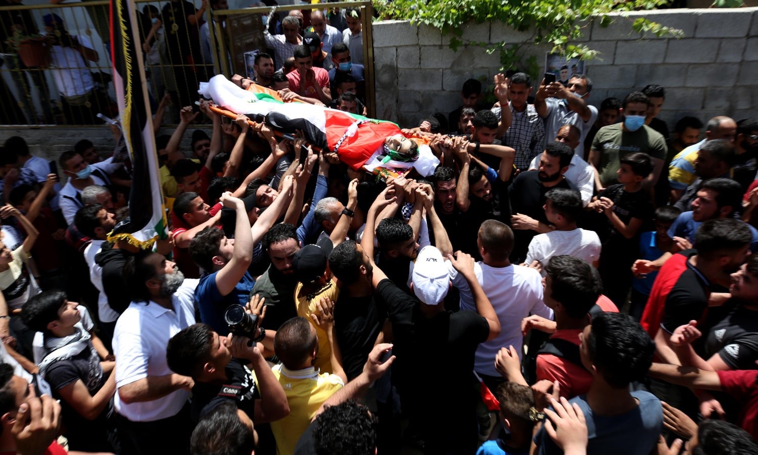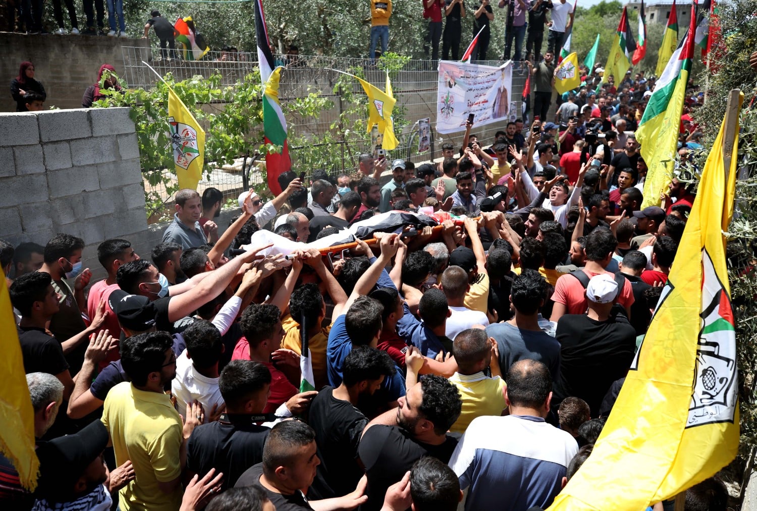 ورفع المشاركون الاعلام الفلسطينية وصور للشهيد خلال مسيرة تشيع الجثمان التي وصلت الى منزله حيث القيت نظرة الوداع الاخير ومن ثم انطلقت من مسجد القرية بعد الصلاة عليه وجابت عددا من شوارع القرية وصولا الى مقبرة القرية.
