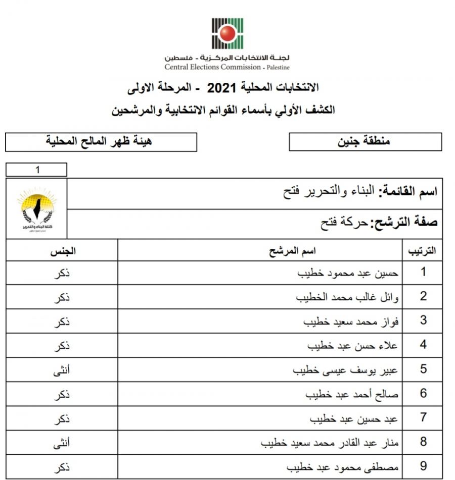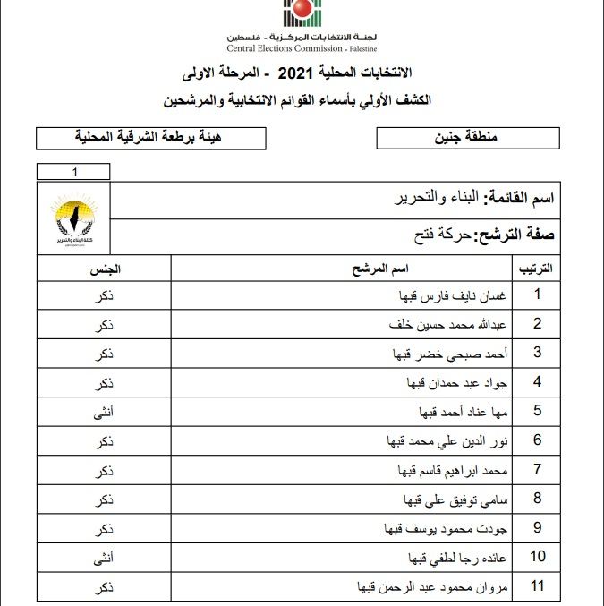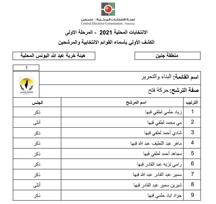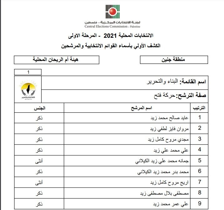 أعلنت لجنة الانتخابات المركزية الفلسطينية اليوم الأحد، الكشف الأولي للقوائم المرشحة للانتخابات المحلية 2021، والبالغ عددها 765 قائمة انتخابية ترشحت في 329 هيئة محلية من أصل 376 مشمولة في المرحلة الأولى من الانتخابات المحلية المقرر الاقتراع فيها يوم 11/12/2021.