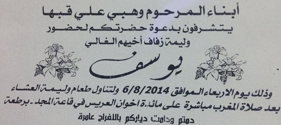 برطعة | مناسبات سعيدة .... وليمة زفاف يوسف وهبي كبهاابناء المرحوم وهبي علي كبها يتشرفون بدعوة حضرتكم لحضور وليمة زفاف أخيهم يوسف ... دمتم ودامت دياركم بالافراح عامرة 02/08/2014 17:05
