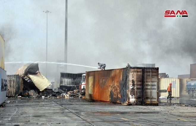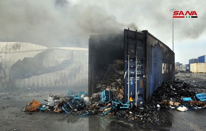 نشرت وكالة الانباء السورية "سانا" صورا من داخل ساحة الحاويات التي استهدفها طيران الاحتلال الاسرائيلي فجر اليوم الثلاثاء، في ميناء اللاذقية في سوريا.