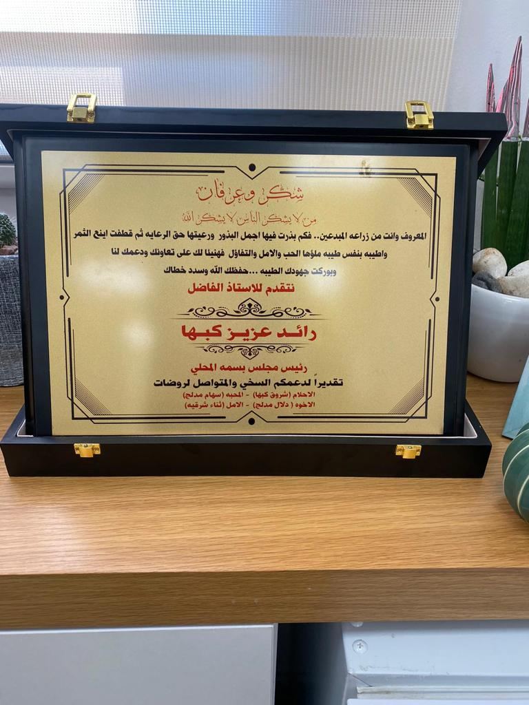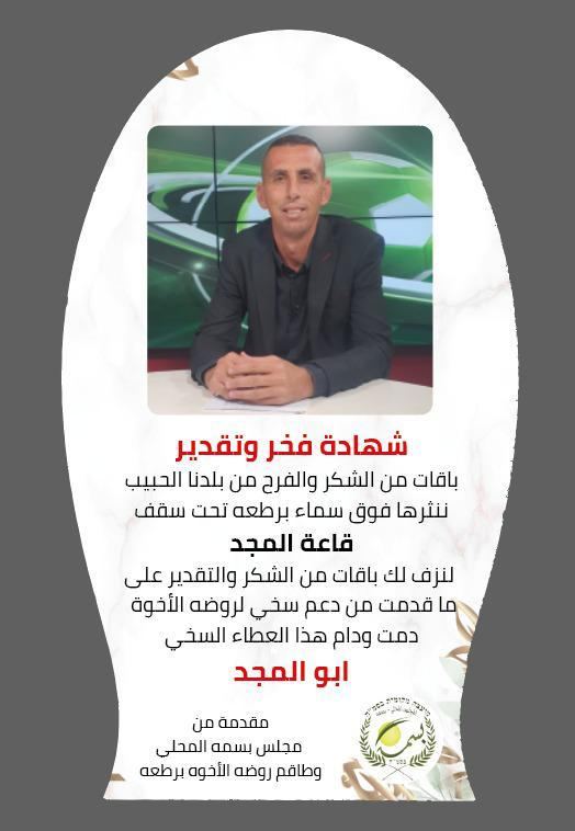 " لنا الفخر الكبير اننا ابناء هذه البلد برطعه الذي يقودها رجال هم صناع السعاده والفرح لطلابنا واطفالنا ببسمه وعلى راسهم رئيس مجلس بسمه المحلي الاستاذ رائد كبها كل الفخر الكبير أنننا نعمل معكم ولنا الفخر اننا قد صعدنا معكم سلم النجاح، والرقي ببسمه،لذا لكم خالص تقديرنا.