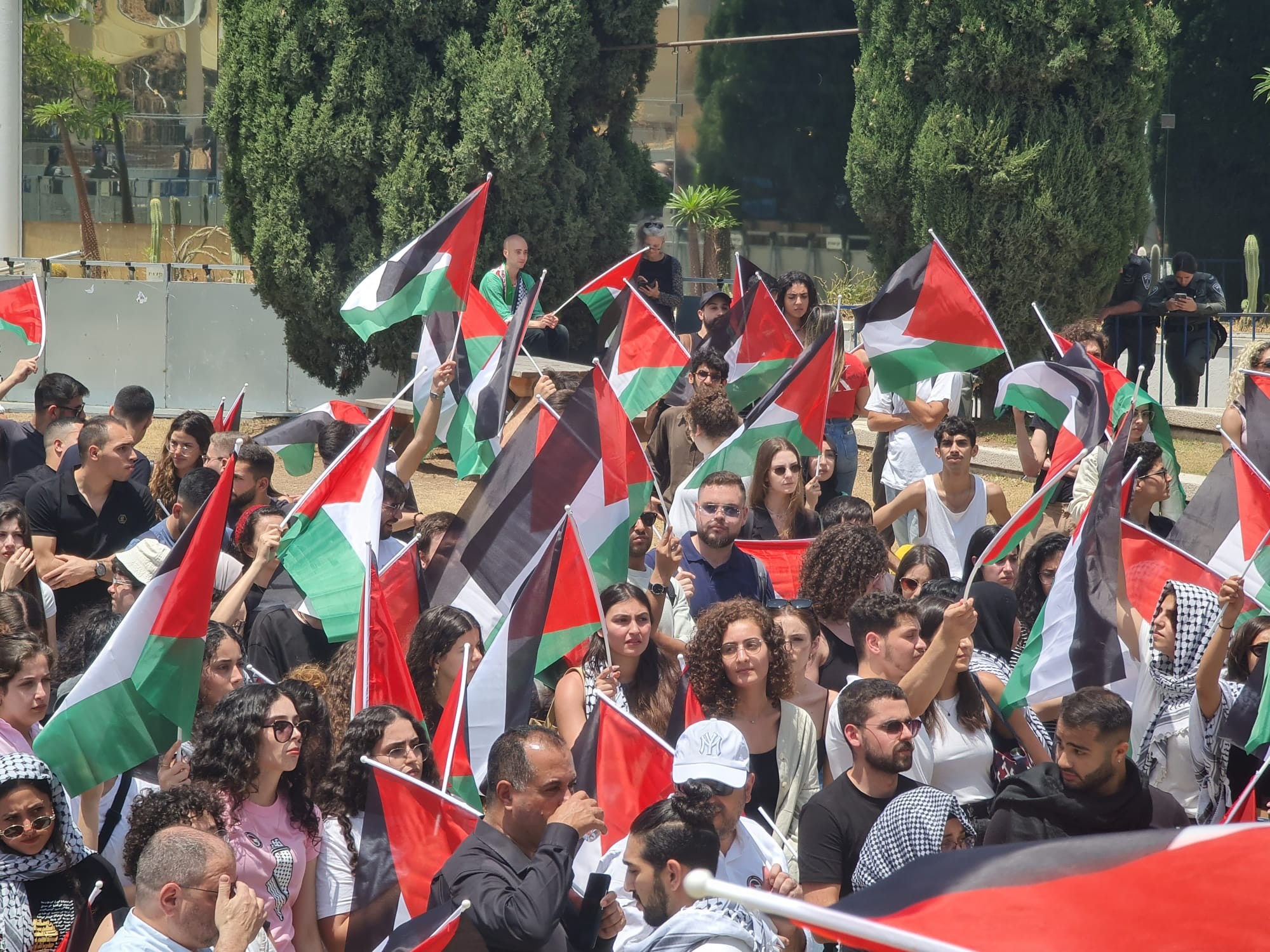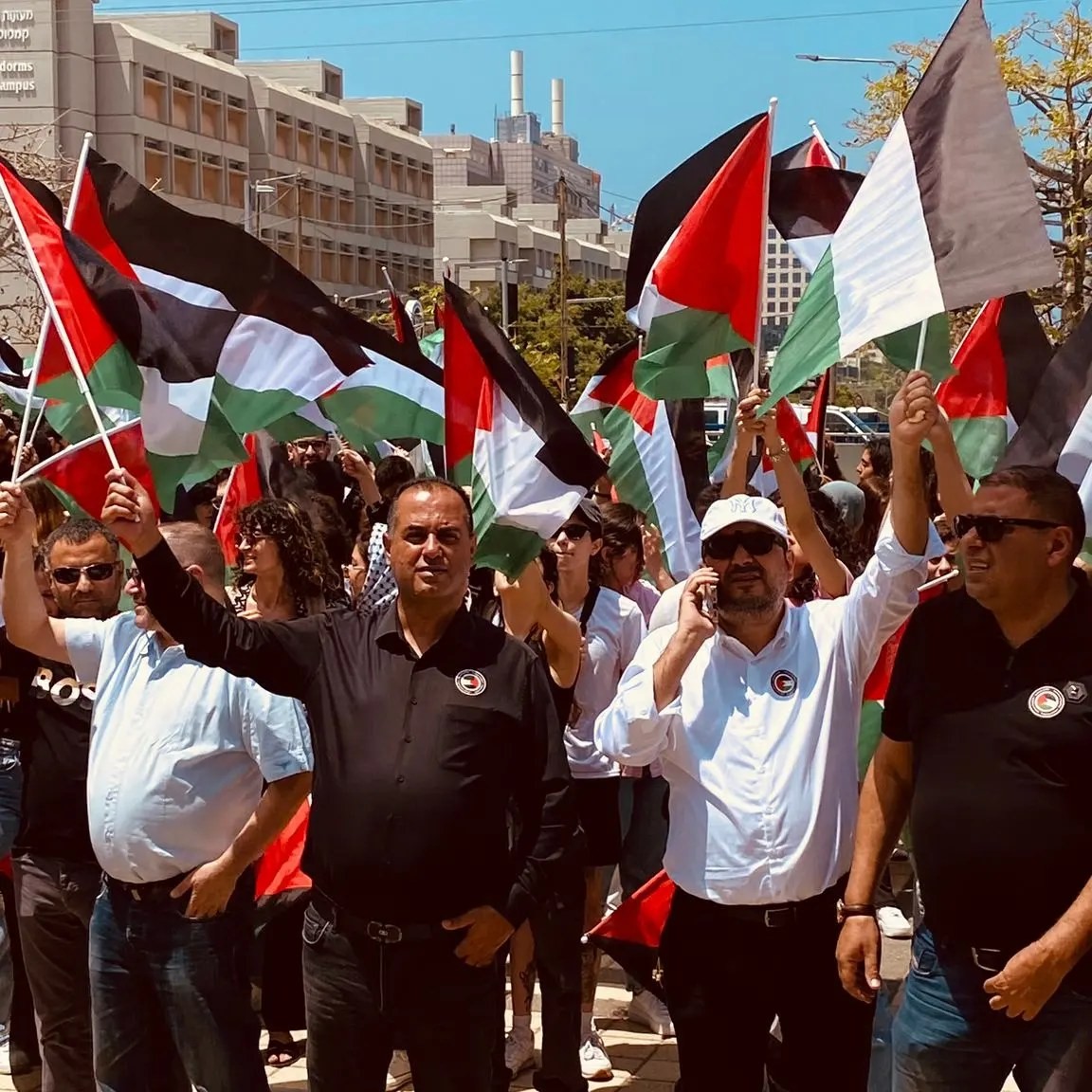 ورفع الطلاب العرب الأعلام الفلسطينية وارتدوا الكوفيات والقمصان السوداء بدون أي رموز أو أعلام حزبيّة، وأنشدوا "موطني"، ورددوا هتافات وطنية.