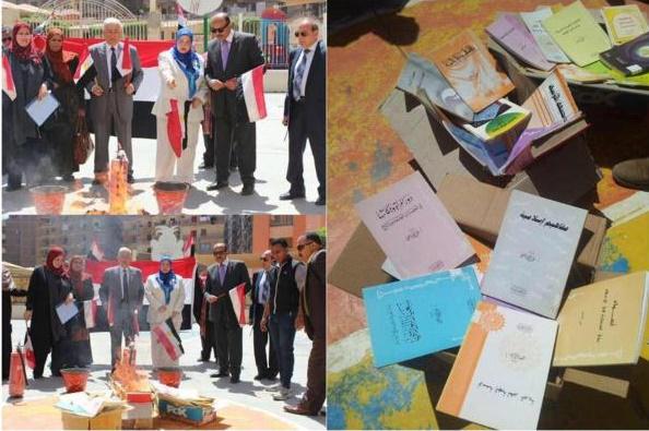 وتظهر في الصور المنتشرة عبر مواقع التواصل الاجتماعي مديرة مديرية التعليم بالجيزة وكيلة الوزارة، ومعها مدير مدرسة "فضل الحديثة" بالجيزة وهما يجمعان كتب التراث الإسلامي في حوش المدرسة ثم يقومان بحرقها بالكامل بحجة أن هذه الكتب تحرض على العنف والإرهاب.