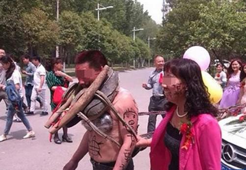 تداول مستخدمو الإنترنت الصينيون صورًا مثيرة للجدل يظهر فيها عريس يطوف الشوارع مع عروسه مربوطًا بطوق في عربة الزفاف بطريقة مهينة جدًا، بدلاً من أن يطوف الشوارع مع عروسه بكامل أناقته داخل سيارة زفاف مكشوفة.