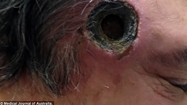 استخدم رجل أسترالي مصاب بسرطان الجلد، مرهما كثيفا أسود اللون من صنع معالج محلي يستخدم طرق بديلة في العلاج، وكانت النتيجة حدوث ثقب في الرأس. أصيب المواطن الاسترالي (55 سنة) بسرطان الجلد، وقرر استخدام المرهم المصنوع من الاعشاب، الذي اشتراه من معالج محلي يستخدم طرق بديلة في علاج الامراض، للتخلص من سرطان الجلد. استمر الرجل في استخدام المرهم مدة اربعة اشهر، ولكن لم يعرف ما كان يشعر به أثناء ذلك. ولكن بعد انقضاء هذه الفترة حدث في صدغه الأيمن ثقب أسود قطره 2.5 سم، سبب له صداعا شديدا نقل على اثره الى المستشفى المحلي بمدينة بريزبن. فحص الاطباء الرجل وانذهلوا من الذي شاهدوه. وحسب قول المريض، فإنه تدخل في تركيب المرهم مواد مخدرة مثل مادة "سانغيونارين" المستخرجة من جذور نبتة برية، والممزوجة مع كلوريد الزنك، الذي يعمل على تآكل الأسطح، والجلد. قرر الأطباء في بداية الامر اجراء عملية جراحية لهذا الرجل، ولكن بعد فحصه جيدا قرروا معالجته من دون تدخل جراحي، ووصفوا له مجموعة ادوية مرخصة ليستخدمها في ترقيع الثقب الذي في راسه وهو في منزله.