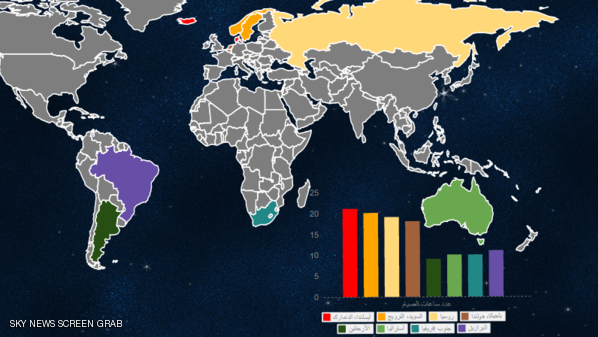 وعلى جانب آخر أشار تقرير لموقع كوارتز إلى أن المسلمين في العاصمة الأرجنتينية بيونس آيرس سيصومون أقل عدد من الساعات في شهر رمضان الحالي، بنحو 9 ساعات صيام في المتوسط.