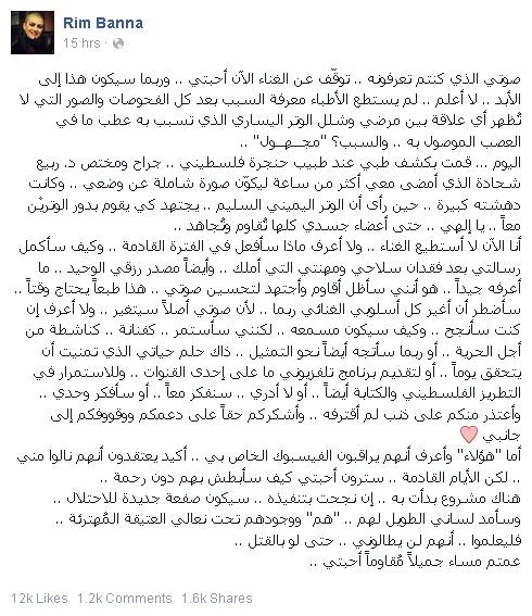 قالت المطربة الفلسطينية ريم البنا , انها لن تستطيع اغناء من جديد وربما للابد بسبب مرض اصاب صوتها.