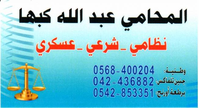 المحامي عبد الله رجا كبهاالمحامي عبد الله رجا كبها نظامي - شرعي - عسكري* قضايا عمّالية* شيكات* أراضي* تأمين* مطالبات مالية* برطعة الشرقيةجنين - عمارة العدل - الطابق الخامس0568400204 0542853351 042436882 01/02/2016 14:22