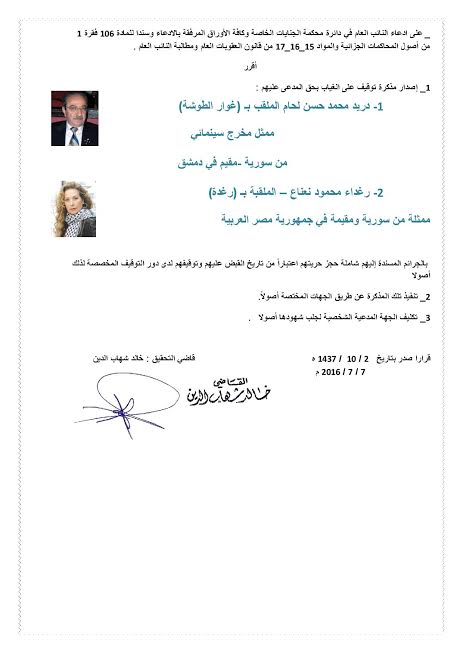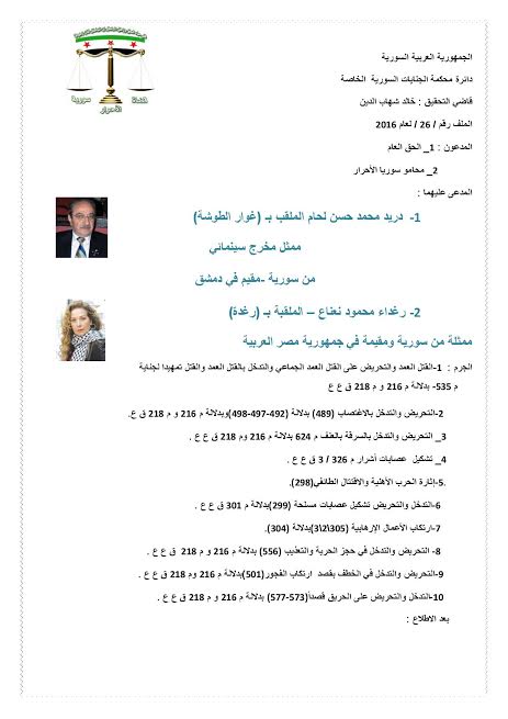 حيث تحتوي مذكرة التوقيف على 10 تهم موجهة لكل من "رغدة " و "دريد لحام " .