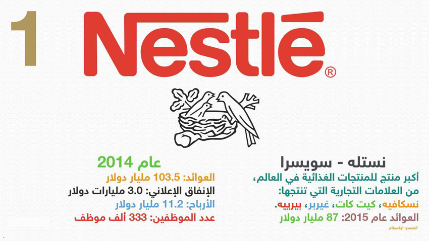 وأكبر هذه الشركات من حيث العوائد والأرباح هي شركة نستلة السويسرية وبلغت أرباحها خلال العام 2015 نحو 87 مليار دولار، ومن بين منتجاتها المعروفة: نسكافيه وكيت كات ونسكويك.