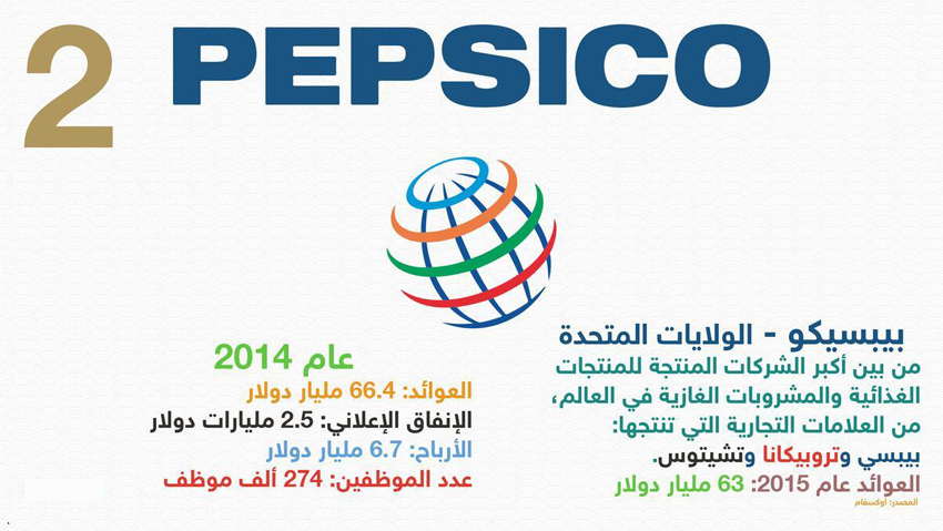 في المركز الثاني جاءت شركة بيبسيكو الأميركية، بعوائد بلغت 63 مليار دولار، ومن بين منتجاتها، إلى جانب بيبسي وسفن أب وماونتن ديو، وتروبيكانا، وتشيتوس وغيرها.