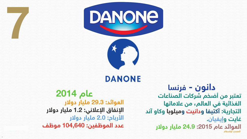 وتلتها من حيث العوائد شركة دانون الفرنسية بعوائد زادت على 24.9 مليار دولار، ومن بين أبرز منتجاتها أكتيفا ودانيت وميلوبا و"كاو آند غايت" وغيرها من منتجات الألبان والحليب والمياه الغازية.