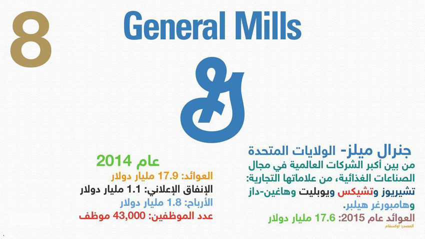 في المركز الثامن جاءت شركة جنرال ميلز بعوائد بلغت 17.6 مليار دولار. ومن بين منتجات هذه الشركة الأميركية آيس كريم هاغن داز، ويوبليت.