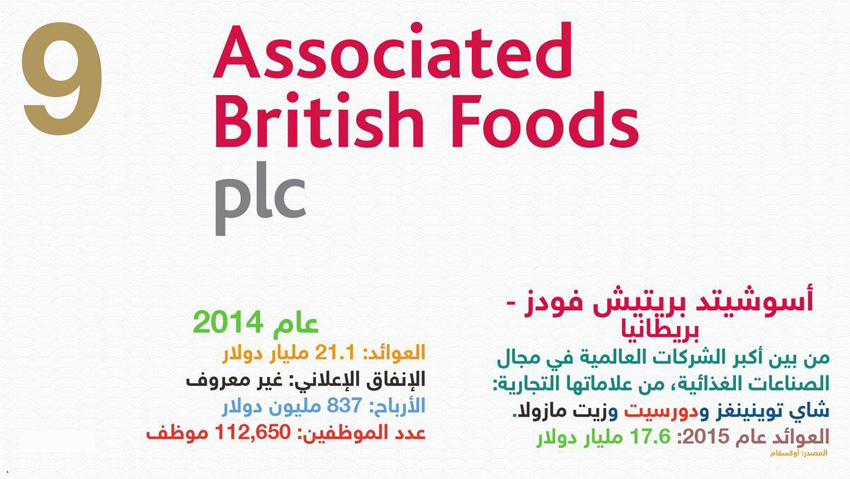 واحتلت شركة أسوشيتد فودز البريطانية في المركز التاسع بعوائد وصلت إلى 17.6 مليا دولار. ومن بين أبرز العلامات التجارية التي تنتجها شاي توينينغز ودورسيت وزيت مازولا.