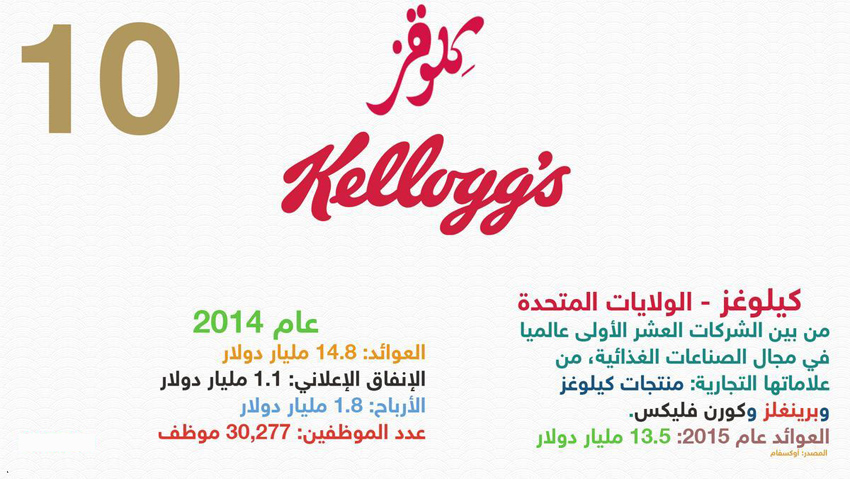 في المركز العاشر لأكبر الشركات المنتجة للمواد الغذائية جاءت شركة كيلوغز، المشهورة بالمنتج الذي يحمل الاسم نفسه إلى جانب شيبس برينغلز، وحققت عوائد عام 2016 بلغت نحو 13.5 مليار دولار.