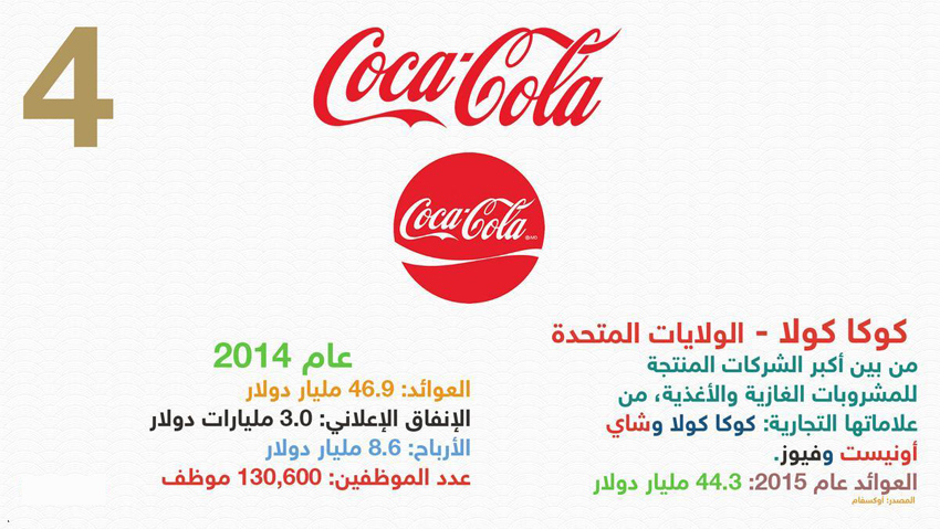 في المركز الرابع، جاءت شركة كوكا كولا الأميركية التي وصلت عوائدها عام 2015 إلى 44.3 مليار دولار، ولعل أبرز منتجاتها المشروبات الغازية مثل كوكا كولا وفانتا وسبرايت وغيرها.