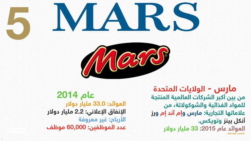خامسة جاءت شركة مارس الأميركية، المعروفة بالشوكولاتة التي تحمل الاسم نفسه، بعوائد بلغت 33 مليار دولار.