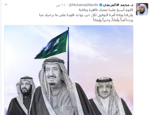 وعلى نفس خطى العريفي قال الشيخ عايض القرني: “اللهم وفّق مليكنا خادم الحرمين الشريفين وولي عهده وولي ولي عهده لما تحب وترضى، واحفظ مملكتنا من الفتن ما ظهر منها وما بطن”، مع صورة تجمع الملك سلمان بمحمد بن نايف ومحمد بن سلمان.